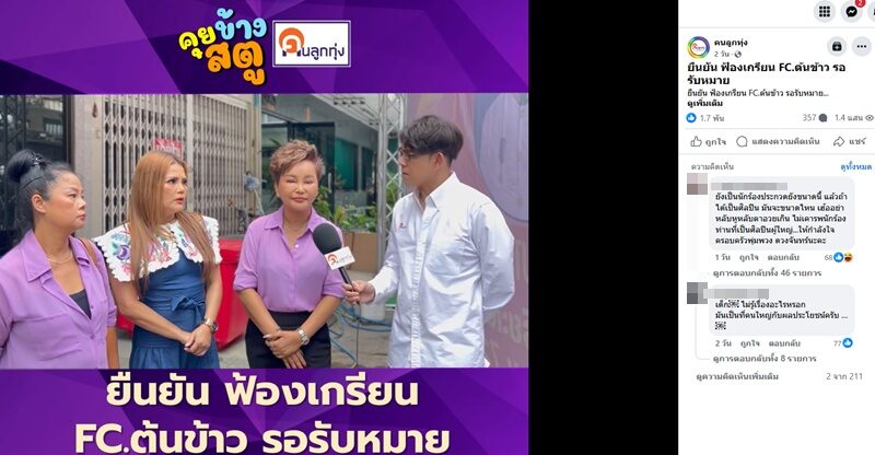 ล่าสุด เพจ คนลูกทุ่ง โพสต์คลิป ยืนยันฟ้องเกรียน FC ต้นข้าว รอรับหมาย โดย โอ่ง สลักจิต ดวงจันทร์ กล่าวถึงการดำเนินคดีดังกล่าวว่า “ไม่ได้อยากมีเรื่อง ไม่ได้อยากรบกับใครทั้งนั้น เราอยากทำงาน แต่เมื่อเกิดการเข้าใจผิดกันขึ้นมา ก็ไม่เห็นจะมีใครมาขอโทษ ก็ตามนั้น ”