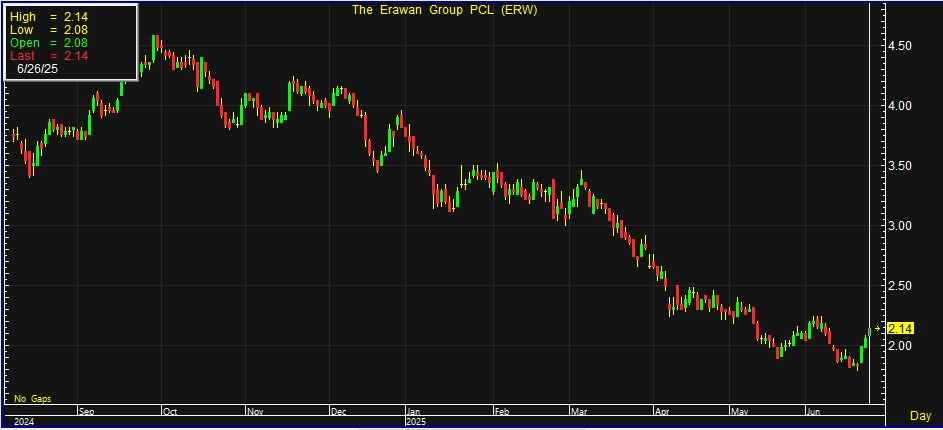 ผู้สื่อข่าวรายงานว่า วานนี้ (25 มิถุนายน 2568) มีแรงซื้อเก็งกำไรเข้ามาในหุ้น บริษัท ดิ เอราวัณ กรุ๊ป จำกัด (มหาชน) หรือ ERW หลังคาดว่าจะได้รับผลบวกจากโครงการ “เที่ยวไทยคนละครึ่ง 2568” จะเริ่มลงทะเบียน 1 กรกฎาคม 2568 และเริ่มใช้สิทธิได้ตั้งแต่วันที่ 4 กรกฎาคม 2568 ถึงวันที่ 31 ตุลาคม 2568 ครอบคลุมทั้งค่าที่พัก และคูปองอาหาร หรือบริการท่องเที่ยว ส่งผลให้การซื้อขายระหว่างราคาหุ้น ERW ปรับตัวขึ้นไปสูงสุดที่ 2.08 บาท ก่อนจะมาปิดตลาดที่ราคา 2.06 บาท เพิ่มขึ้น 0.07 บาท หรือคิดเป็นเพิ่มขึ้น 3.52% ด้วยมูลค่าการซื้อขายกว่า 49.14 ล้านบาท