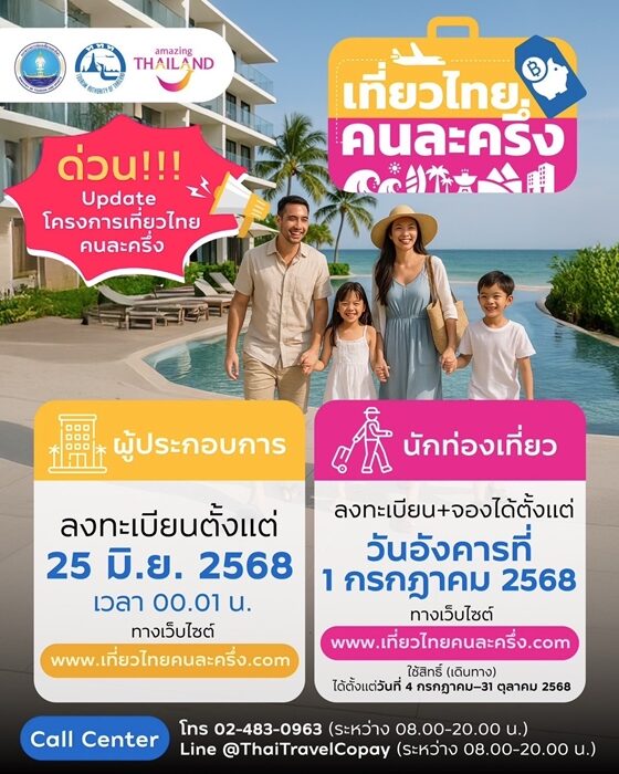 วันที่ 25 มิ.ย.2568 นายสรวงศ์ เทียนทอง รมว.การท่องเที่ยวและกีฬา เปิดเผยว่า โครงการเที่ยวไทยคนละครึ่ง ปี 2568 เป็นมาตรการกระตุ้นเศรษฐกิจและการท่องเที่ยวในประเทศ โดยเฉพาะช่วงโลว์ซีซั่น (ก.ค.-ก.ย.) สร้างรายได้ผู้ประกอบการโรงแรม ร้านอาหาร และธุรกิจท่องเที่ยวส่งเสริมการเดินทางเมืองหลัก