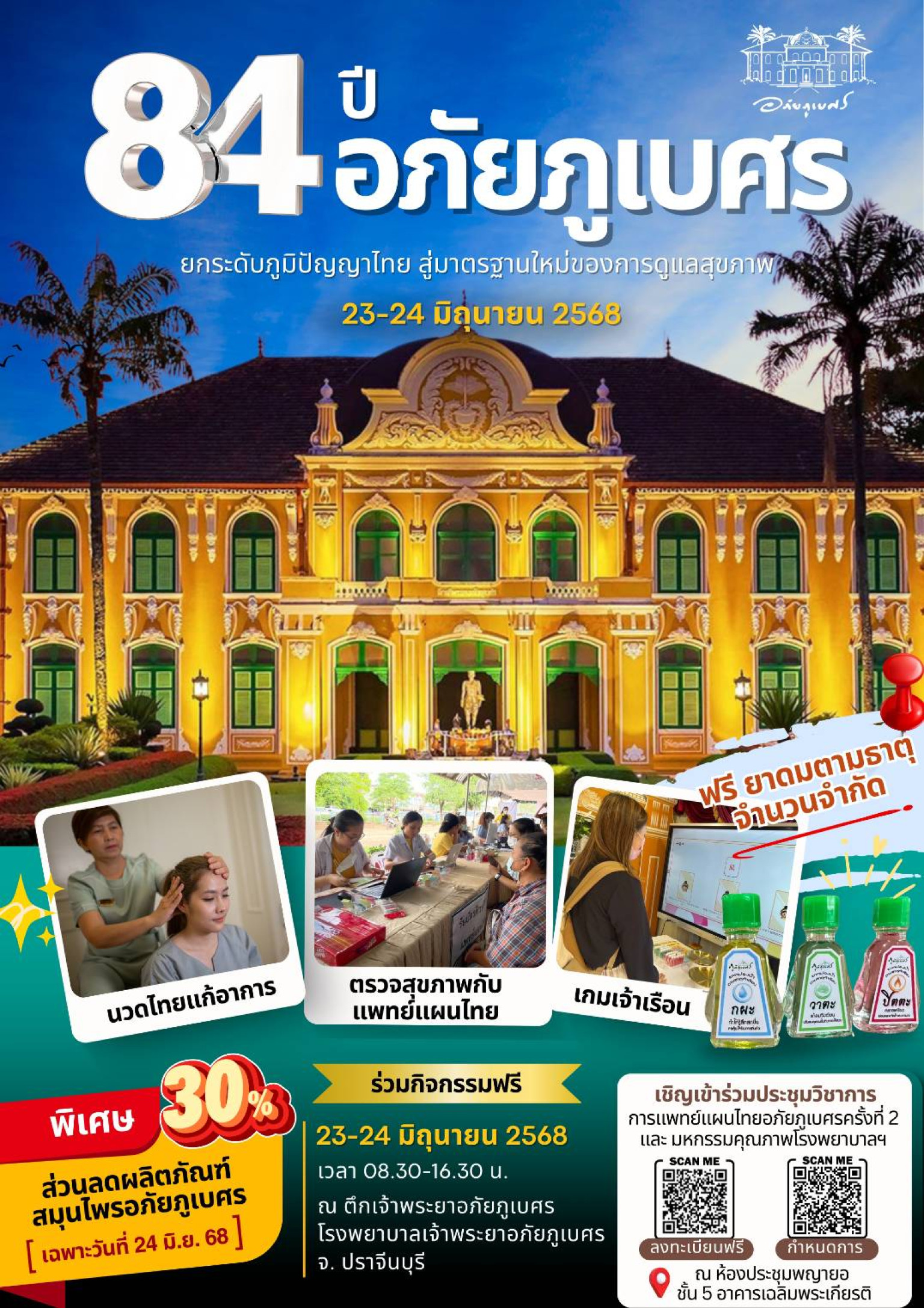 พญ.ชนิดา สยุมภูรุจินันท์ ผู้อำนวยการ รพ.เจ้าพระยาอภัยภูเบศร กล่าวว่า ในโอกาสที่โรงพยาบาลเจ้าพระยาอภัยภูเบศร กำลังจะครบรอบ 84 ปี ในวันที่ 24 มิถุนายน 2568 เพื่อเป็นการเฉลิมฉลองวาระสำคัญนี้ โรงพยาบาลฯ ได้จัดกิจกรรมขึ้นระหว่างวันที่ 23 – 24 มิถุนายน โดยมีพิธีไหว้พระ ทำบุญตักบาตร พิธีบวงสรวงท่านเจ้าพระยาอภัยภูเบศร เพื่อรำลึกถึงบุญคุณท่านที่ทำให้มีโรงพยาบาลเจ้าพระยาอภัยภูเบศรในวันนี้ นอกจากนี้ยังมีการจัดการประชุมวิชาการ ด้านการแพทย์แผนไทย เผยแพร่องค์ความรู้และประสบการณ์สู่สาธารณะ โดยมีหัวข้อที่น่าสนใจ ได้แก่ การใช้นวดไทยร่วมกับการฟื้นฟูสภาพผู้ป่วยโรคหลอดเลือดสมอง ด้วยการแพทย์แผนปัจจุบัน การรักษาผู้ป่วยโรคกระดูกและข้อด้วยยาสมุนไพรและหัตถการ ทางการแพทย์แผนไทย รวมถึงการดูแลหญิงตั้งครรภ์แบบบูรณาการ