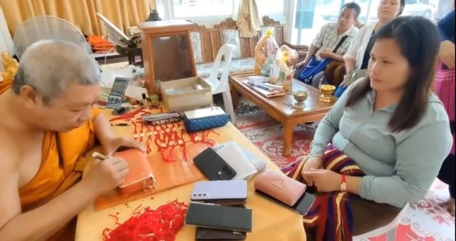 ก่อนที่จะพากันเดินลงมาจากบนวิหารและต่อคิวเข้าแถวรอเจิมโทรศัพท์และกระเป๋าสตางค์เสริมดวงชะตาบารมีกับหลวงเตี่ยซึ่งหลายคนเชื่อกันว่ามาที่นี่แล้วจะต้องนำกระเป๋าสตางค์และโทรศัพท์มือถือมาให้หลวงเตี่ยเจิมเพื่อความเป็นสิริมงคลเงินทองไม่ขาดมือค้าขายร่ำรวย บางคนนำกระเป๋าสตางค์กว่า 10 ใบ โทรศัพท์อีกหลายเครื่องมาให้หลวงเตี่ยเจิม
