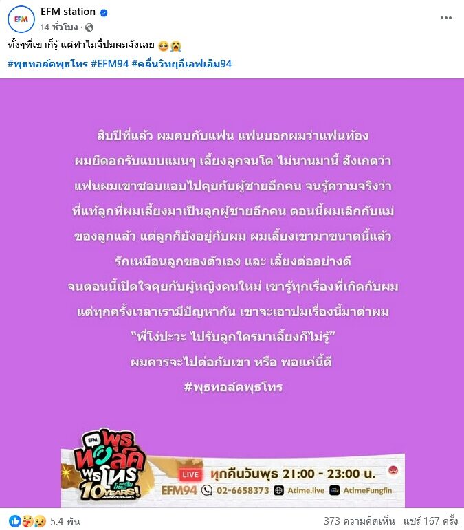 รายการ พุธทอล์คพุธโทร EFM 94โพสต์เคส โจ๋ (นามสมมติ) ชายคนหนึ่งโทรเข้ามาปรึกษาว่า “สิบปีที่แล้ว ผมคบกับแฟน แฟนบอกผมว่าแฟนท้อง ผมยืดอกรับแบบแมนๆ เลี้ยงลูกจนโต ไม่นานมานี้ สังเกตว่าแฟนผมเขาชอบแอบไปคุยกับผู้ชายอีกคน”