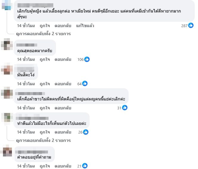 -เด็กคือผ้าขาวไม่ผิดคนที่ผิดคือผู้ใหญ่แต่ผญคนนี้แย่ค่ะเลิกค่ะ เป็นต้น