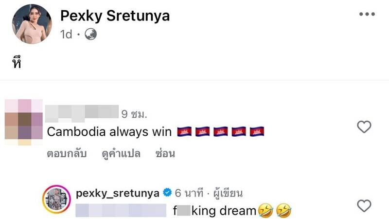 โดยก่อนหน้านี้เจ้าตัวได้ออกมาโพสต์ภาพทหารไทยถือธงชาติไทย เขียนข้อความกำกับว่า“ไทยนี้รักสงบ แต่ถึงรบไม่ขลาด #เปิดก่อนได้ปูด” ปรากฏว่ามีชาวเน็ตกัมพูชาโผล่เข้ามาคอมเมนต์ป่วนว่า “Cambodia always win” ทำเอา สาวเป็กกี้ ทนไม่ไหวสวนกลับทันทีว่า “f--king dream”
