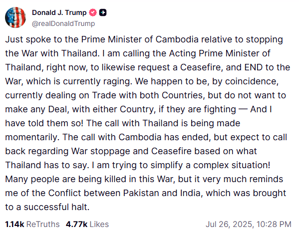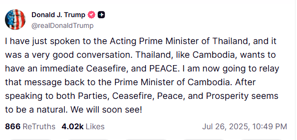 เมื่อเวลา 22.28 น. วันที่ 26 ก.ค. 2568 โดนัลด์ ทรัมป์ ประธานาธิบดีสหรัฐอเมริกา ได้โพสต์ข้อความในโซเชียลมีเดีย ขอให้ประเทศไทยและกัมพูชาหยุดยิงทันที โดยระบุว่า "ผมเพิ่งพูดคุยกับนายกรัฐมนตรีกัมพูชาเกี่ยวกับการหยุดสงครามกับประเทศไทย ตอนนี้ผมกำลังจะโทรหารักษาการนายกรัฐมนตรีของไทย เพื่อขอให้มีการหยุดยิงและยุติสงครามที่กำลังปะทุอยู่"