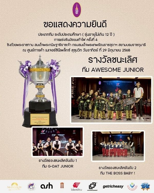 รางวัลชนะเลิศ ทีม AWESOME JUNIOR ถ้วยพระราชทาน สมเด็จพระกนิษฐาธิราชเจ้า กรมสมเด็จพระเทพรัตนราชสุดา ฯ สยามบรมราชกุมารี