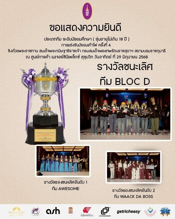รางวัลชนะเลิศ ทีม BLOC D ถ้วยพระราชทาน สมเด็จพระกนิษฐาธิราชเจ้า กรมสมเด็จพระเทพรัตนราชสุดา ฯ สยามบรมราชกุมารี