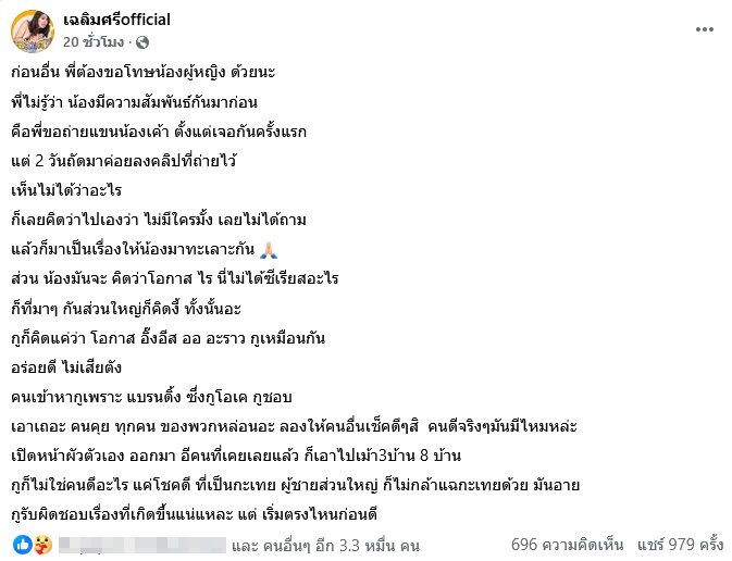 ต่อมา มิกซ์ ก็ได้โพสต์ขอโทษทางผู้หญิงว่า “ก่อนอื่น พี่ต้องขอโทษน้องผู้หญิง ด้วยนะ พี่ไม่รู้ว่า น้องมีความสัมพันธ์กันมาก่อน คือพี่ขอถ่ายแขนน้องเค้า ตั้งแต่เจอกันครั้งแรก แต่ 2 วันถัดมาค่อยลงคลิปที่ถ่ายไว้ เห็นไม่ได้ว่าอะไร ก็เลยคิดว่าไปเองว่า ไม่มีใครมั้ง เลยไม่ได้ถาม แล้วก็มาเป็นเรื่องให้น้องมาทะเลาะกัน ”