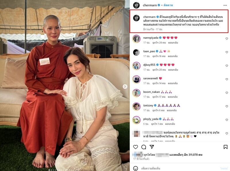 โดยก็มีเพื่อนๆในวงการเข้ามาส่งอิโมจิหัวใจรัวๆ พร้อมทั้งแฟนๆ เข้ามาร่วมอนุโมทนาสาธุกันอย่างต่อเนื่องบางคนบอกน้ำตาไหลเลย อาทิ สวยสะอาด งดงาม มากค่ะ สาธุ , น้ำตาไหลอย่างบอกไม่ถูกกราบอนุโมทนาสาธุบุญในครั้งนี้ด้วยค่ะ , ขอร่วมอนุโมทนาสาธุในบุญนี้ค่ะ เป็นต้น