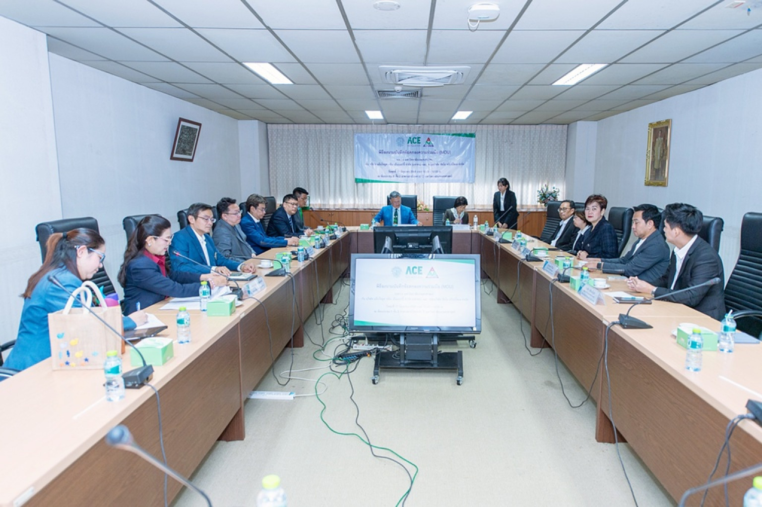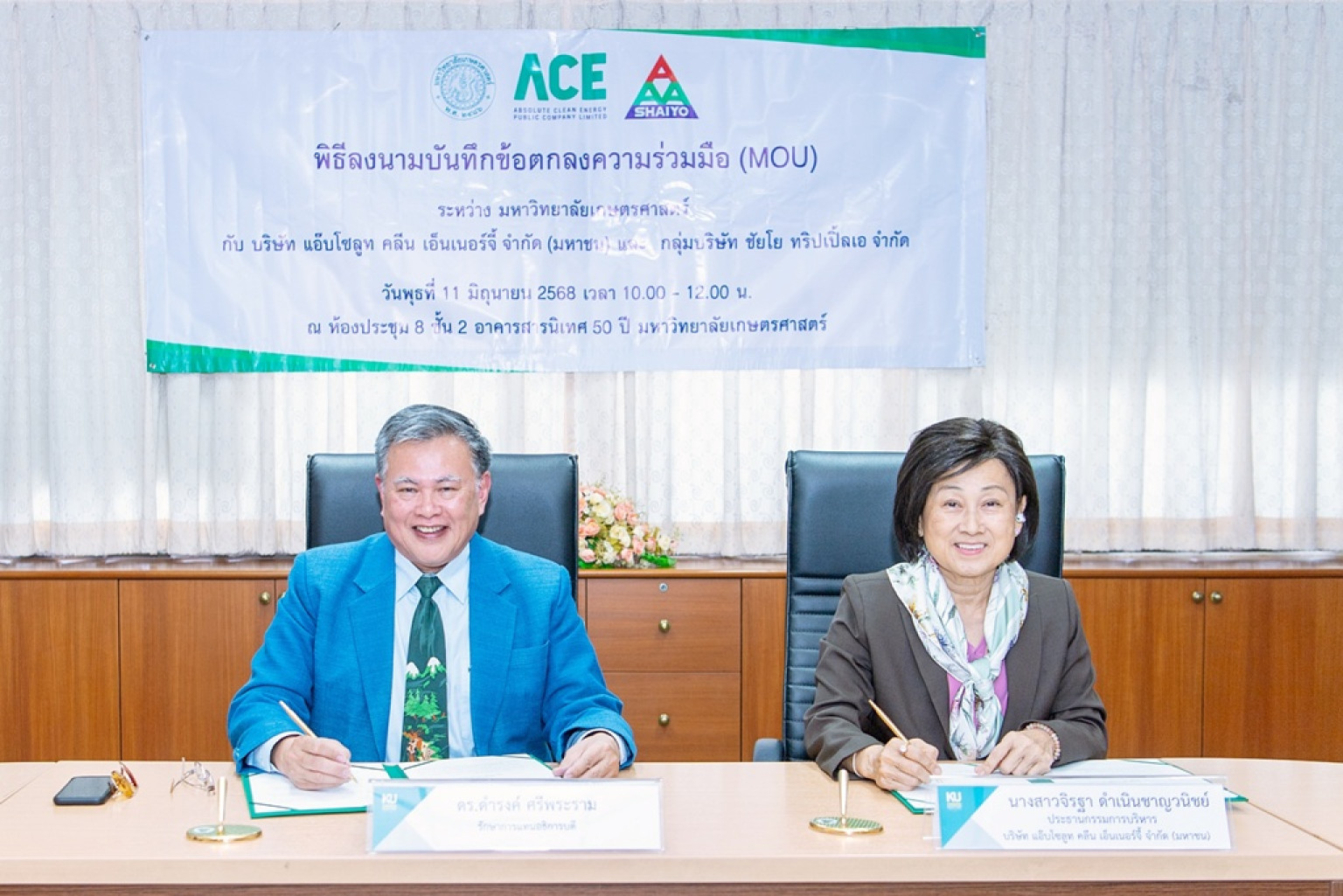 ดร.ดำรงค์ ศรีพระราม รักษาการแทนอธิการบดีมหาวิทยาลัยเกษตรศาสตร์ ร่วมลงนามกับนางสาวจิรฐา ดำเนินชาญวณิชย์ ประธานกรรมการบริหาร บริษัทแอ๊บโซลูท คลีน เอ็นเนอร์จี้ จำกัด (มหาชน) และ นายธีรวุฒิ ทรงเมตตา ประธานกรรมการบริหารกลุ่มบริษัทชัยโย ทริปเปิ้ลเอ ในบันทึกข้อตกลงความร่วมมือทางวิชาการ ระหว่างมหาวิทยาลัยเกษตรศาสตร์ กับบริษัทแอ๊บโซลูท คลีน เอ็นเนอร์จี้ จำกัด (มหาชน) และกลุ่มบริษัทชัยโย ทริปเปิ้ลเอ โดยมี รศ.ดร.ประทีป ด้วงแค คณบดีคณะวนศาสตร์ รศ.ดร.ณัฐพล จันทร์พาณิชย์ คณบดีคณะวิศวกรรมศาสตร์ ศรีราชา และ รศ.ดร.ตุลวิทย์ สถาปนจารุ คณบดีคณะสิ่งแวดล้อม ร่วมลงนามเป็นพยาน ณ ห้องประชุม 8 อาคารสารนิเทศ 50 ปี มหาวิทยาลัยเกษตรศาสตร์