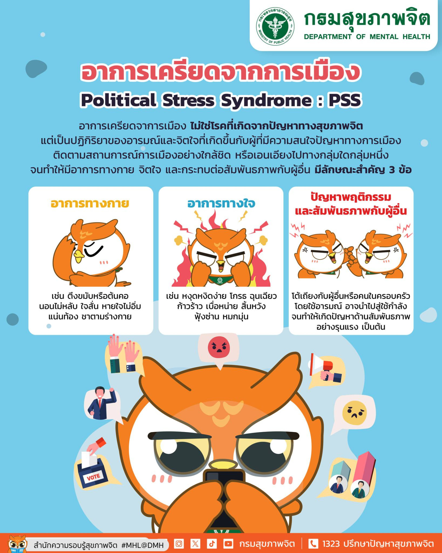 กรมสุขภาพจิต แจ้งเตือนประชาชนระวังอาการเครียดจากสถานการณ์การเมือง หรือ Political Stress Syndrome (PSS) ซึ่งส่งผลทั้งทางกาย ใจ และความสัมพันธ์ ขอให้ใช้สติรับฟังข้อมูลอย่างรอบคอบ หลีกเลี่ยงถ้อยคำรุนแรง และดูแลใจด้วย 5 วิธี คือ รู้เท่าทันอารมณ์ จำกัดเวลาติดตามข่าว ดำรงชีวิตสมดุล เคารพความคิดเห็นที่หลากหลาย และพักผ่อนผ่อนคลายอย่างเหมาะสม