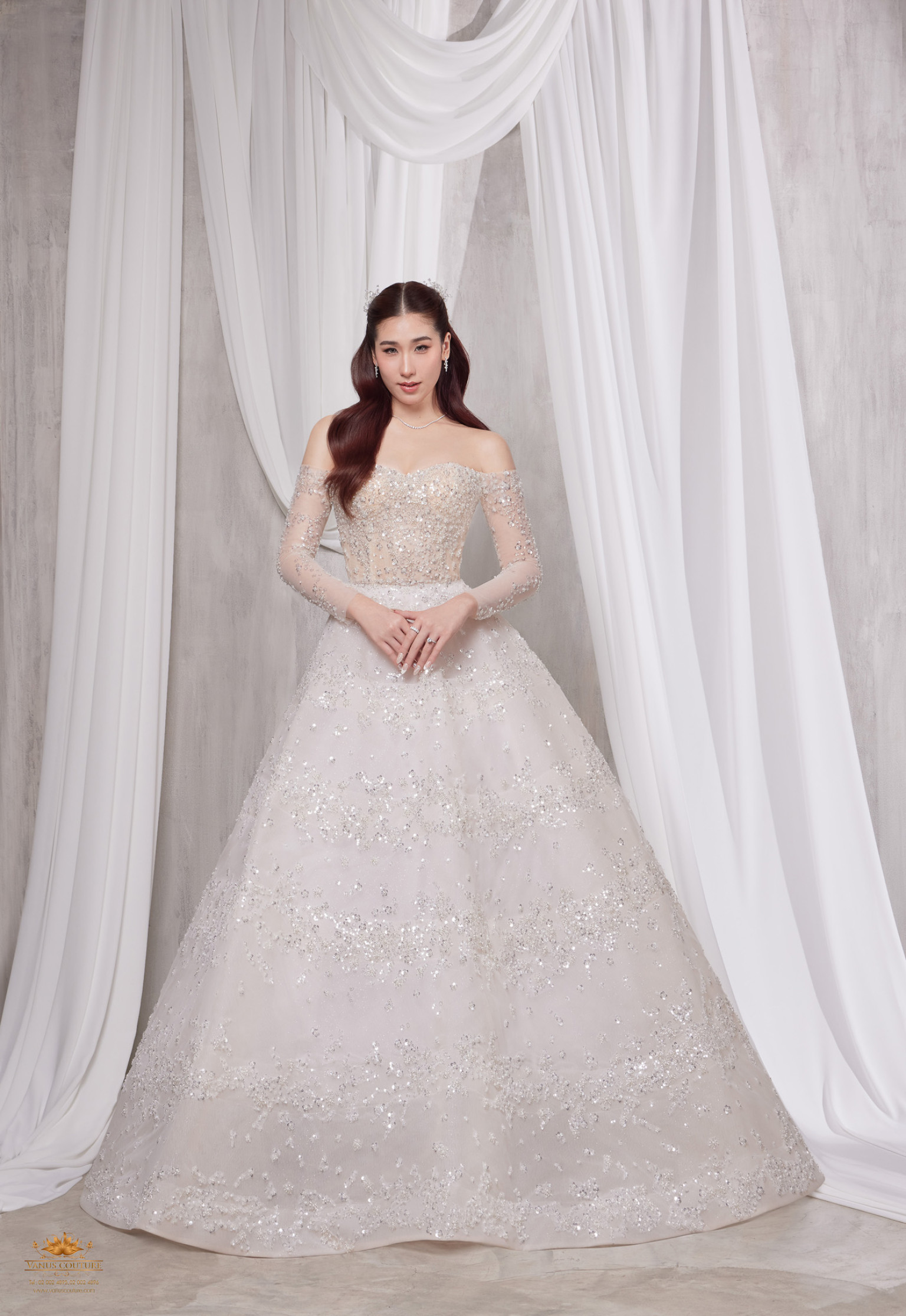 ชุดที่ 4 ชุดแต่งงานทรงปาดไหล่แขนยาว เรียบหรูแต่แฝงไว้ด้วยความละมุนละไม โดดเด่นด้วยกระโปรงทรง A-Line ที่ออกแบบด้วยโครงสร้างแบบฝรั่งเศสแท้ จุดเด่นอันเลอค่าคือการตัดเย็บที่ไม่พึ่งพาผ้าโครงอยู่ตัวแบบดั้งเดิม แต่เลือกใช้เทคนิคเฉพาะที่คิดค้นขึ้นใหม่โดยแบรนด์ Vanus Couture เพื่อให้ชุดมีโครงสร้างสมบูรณ์แบบ คงตัวได้โดยไม่ต้องใส่โครงแข็ง ตกแต่งด้วยลวดลาย ปักดอกไม้ยิปโซและยิปซีอย่างละเอียด วิบวับด้วยการปักคริสตัลและเลื่อมเม็ดจิ๋วที่กระจายตัวเป็นเคิร์ฟอย่างมีจังหวะ คล้ายละอองดาวบนพื้นผืนผ้า เนื้อผ้า สีอ่อนที่โปร่งแสงบางเบา ให้ความรู้สึกล่องลอยแต่มั่นคงทุกการเคลื่อนไหวเป็นลุคที่ผสมผสานความโรแมนติกและความสง่างามเข้าไว้ด้วยกันอย่างสมบูรณ์แบบ ชุดนี้เหมาะสำหรับเจ้าสาวผู้หลงใหลในความเรียบหรู หวานแต่มีพลัง และรักความแตกต่างอย่างมีรสนิยม