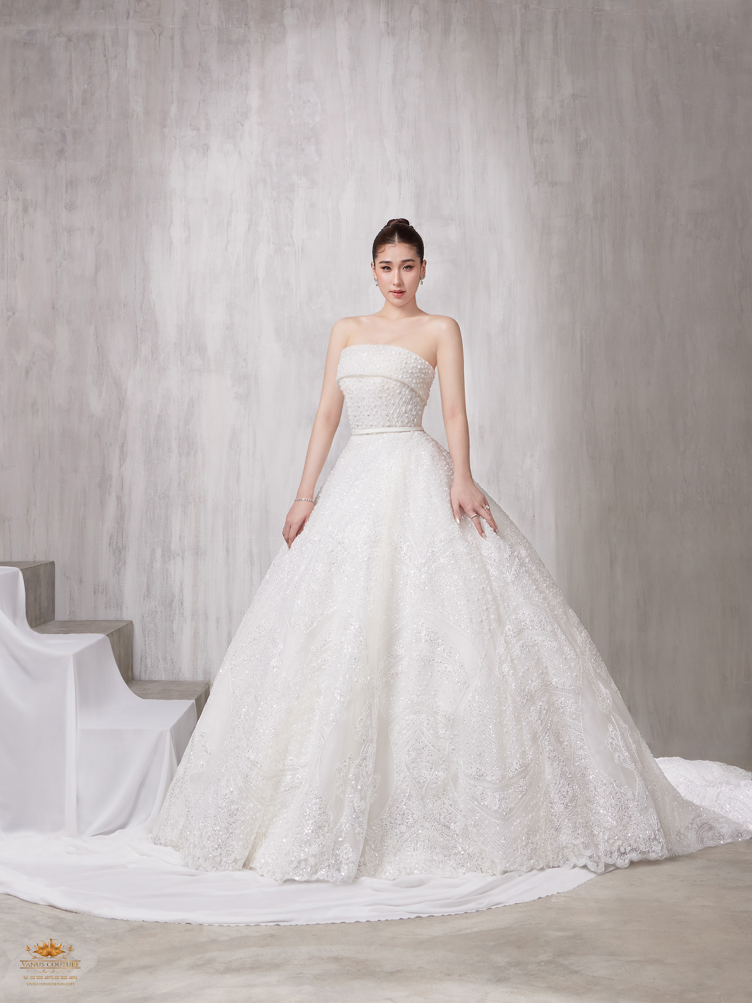 ชุดที 9 ชุดแต่งงาน ทรง A-Line เว้าลึกแบบ Sweetheart ที่ออกแบบให้เจ้าสาวสวยสง่าแต่ยังคงไว้ซึ่งความเซ็กซี่อย่างมีระดับ จุดเด่นของชุดนี้อยู่ที่การเว้าช่วงอกลึกทรงหัวใจอย่างลงตัว เสริมความเซ็กซี่แบบพอดี พร้อมด้วยเทคนิคการ ปักคริสตัลทั้งตัว ที่เรียงร้อยอย่างประณีตด้วยมือทุกเม็ด สร้างความแวววาวทุกครั้งที่แสงกระทบ ตัวกระโปรงถูกออกแบบให้พลิ้วไหวแบบเบาสบายด้วย ผ้าโปร่งเทกเจอร์ละเอียด ที่ยังคงความเปล่งประกายจากการปักคริสตัลทั่วทั้งชุด ทำให้เจ้าสาวดูสวยละมุนตาแต่ไม่จางหายไปจากสายตาใครเลย เหมาะสำหรับงานแต่งที่เน้นความมินิมัลเรียบหรู หรือหรูหราระดับลักซ์ชัวรีไม่ว่าจะจัดในโรงแรม สตูดิโอ หรือสถานที่สุดชิค ชุดนี้คือคีย์หลักของคำว่า “สวยชัดแต่ไม่ต้องพูดเยอะ”
