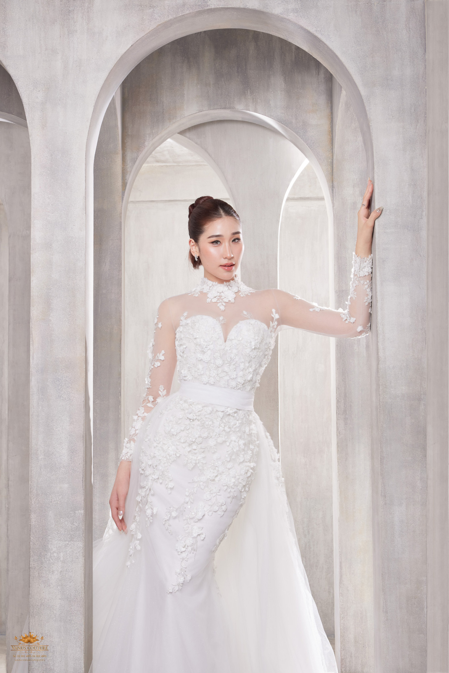 ชุดที่ 7 ชุดแต่งงานทรง Mermaid เกาะอกทรงสวีตฮาร์ต ที่ออกแบบมาเพื่อเจ้าสาวผู้ต้องการความคลาสสิกแต่ไม่ธรรมดา ไฮไลต์ของชุดนี้โดดเด่นด้วย เคปกระโปรงด้านหลัง ที่เพิ่มวอลุ่มให้ช่วงล่างดูสง่าพริ้วไหว เพิ่มความอลังการเมื่อเจ้าสาวเดินเข้าสู่พิธี เปรียบดั่งเจ้าหญิงที่ก้าวออกจากปราสาทหินขาวแห่งยุโรป ส่วนบนของชุดออกแบบเป็นเกาะอกทรงหวานสไตล์ Sweetheart เสริมลูกไม้ฝรั่งเศสชั้นดีที่ถักทอเป็นแขนยาวซีทรู พร้อมดีไซน์คอปีนสุดหรู ที่ถอดแบบมาจากลุคเจ้าหญิงในราชวงศ์อังกฤษ ปักตกแต่งด้วยลวดลายดอกไม้ สามมิติเบาๆ ที่ช่วยขับให้ช่วงตัวดูงดงามสมสัดส่วน เหมาะกับงานแต่งงานในโบสถ์ หรือสถานที่สุดคลาสสิก และเจ้าสาวผู้ต้องการลุคที่ดูสูงศักดิ์ หรูหรา สง่างามทุกย่างก้าว