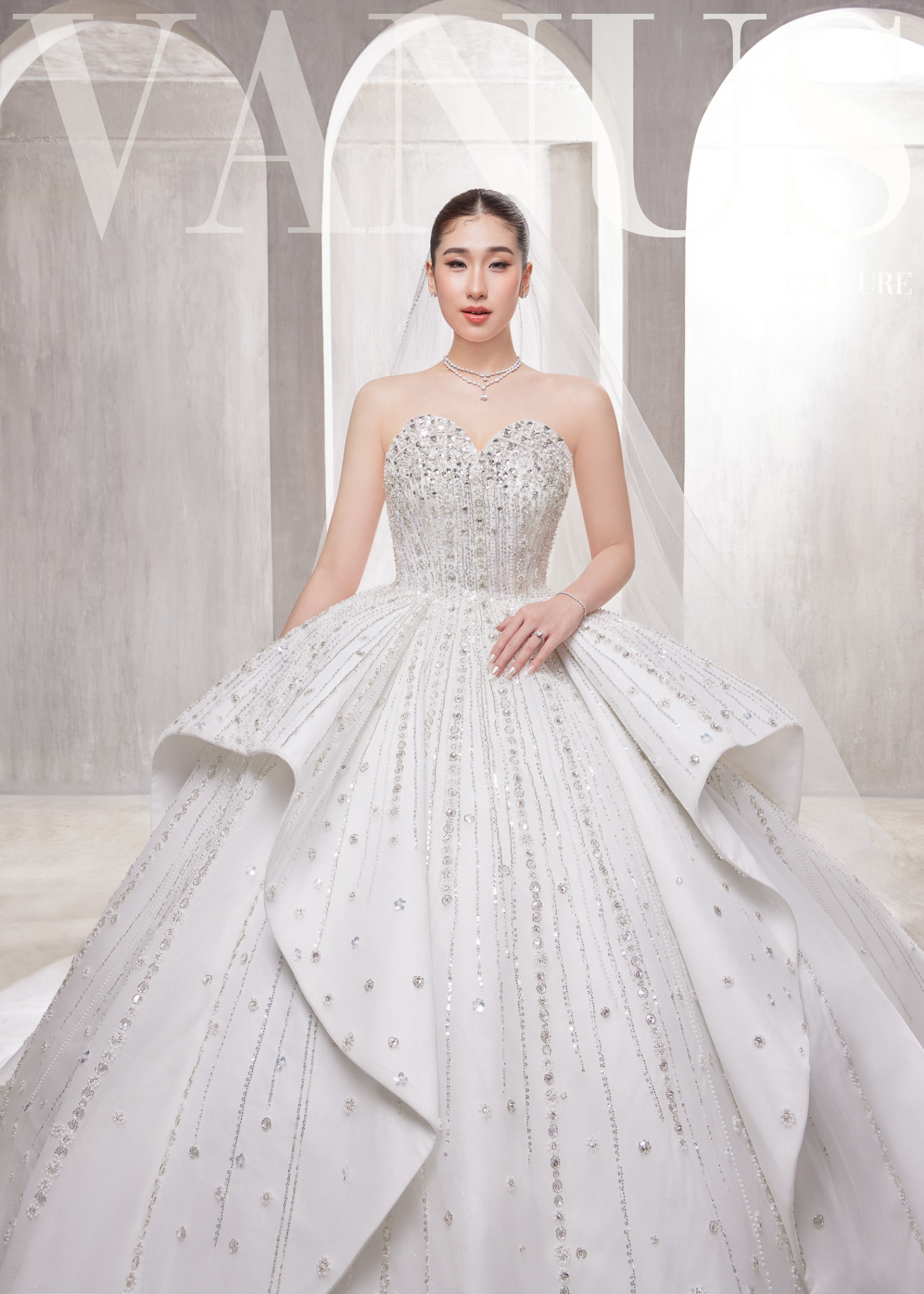 ชุดที่ 6 ชุดแต่งงานทรงปริ๊นเซสเกาะอกสุดตระการตา ที่ได้แรงบันดาลใจจากเจ้าหญิงยุโรปผู้สูงศักดิ์ ผสานความหรูหราเข้ากับดีไซน์ร่วมสมัยได้อย่างลงตัว ไฮไลต์ที่สุดของความเลอค่าของชุดนี้ ได้รังสรรค์จากผ้ามินิมอลที่เป็นงานปักทั้งตัว และประดับคริสตัลมากกว่า 10,000 เม็ดทุกเม็ดถูกจัดวางอย่างมีศิลปะ ไล่ระดับแสงเงาให้องค์รวมดูเจิดจรัสทุกองศา เมื่อเจ้าสาวเคลื่อนไหว ชุดจะเปล่งประกายราวกับถูกสะกดด้วยแสงดาวบนท้องฟ้ายามค่ำคืน บริเวณเกาะอกถูกออกแบบพิเศษด้วยเทคนิค “ทวิต” (Twist) เพื่อให้เกิดเทกซ์เจอร์ที่แตกต่าง สร้างเลเยอร์มิติให้ตัวชุดดูมีพลัง สวยหรูแบบสง่างามไม่จำเจ ชุดนี้คือคำตอบของเจ้าสาวผู้ใฝ่ฝันถึงลุค “ราชนิกุลผู้เลอค่า” ที่ใครเห็นเป็นต้องประทับใจ และเหมาะกับงานแต่งงานสุดอลังในโบสถ์ โรงแรม หรือปราสาทในฝัน