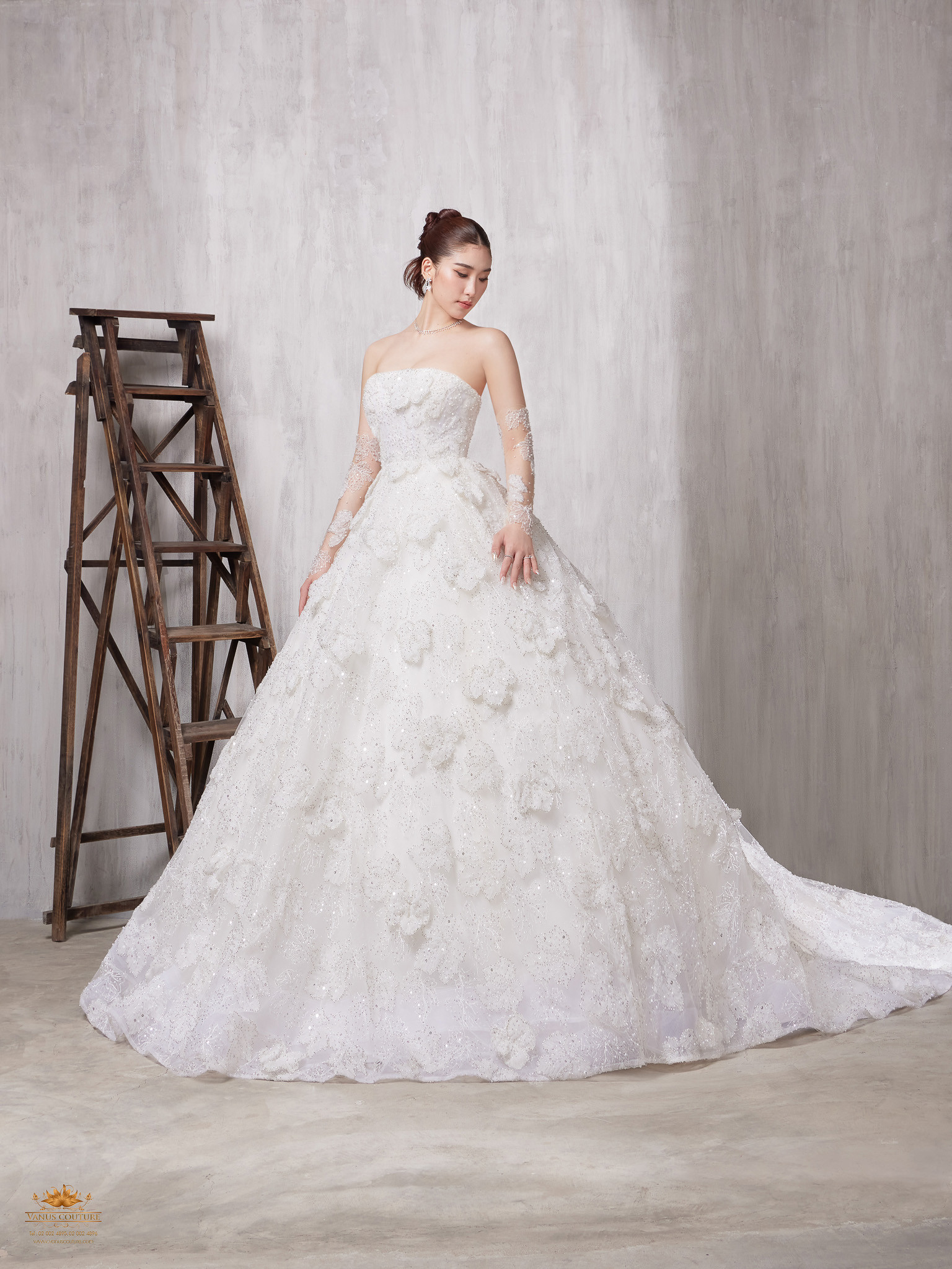 ปิดท้ายด้วยชุดเกาะอกทรง A-line ตัวนี้คือผลงานระดับโอต์กูตูร์ ที่ออกแบบและจัดวางกลีบดอกไม้นับพันอย่างประณีต เพื่อสะท้อนความหรูหรา อ่อนหวาน และอ่อนโยน ดั่งเจ้าสาวผู้มีหัวใจบริสุทธิ์ ดีไซน์อันเป็นเอกลักษณ์นี้ผสมผสานความเป็น Couture เข้ากับ ความรักที่ลึกซึ้งดั่งเทพนิยาย งานดีไซน์ที่ไม่เหมือนใคร มีเพียงหนึ่งเดียวในประเทศไทยเท่านั้น