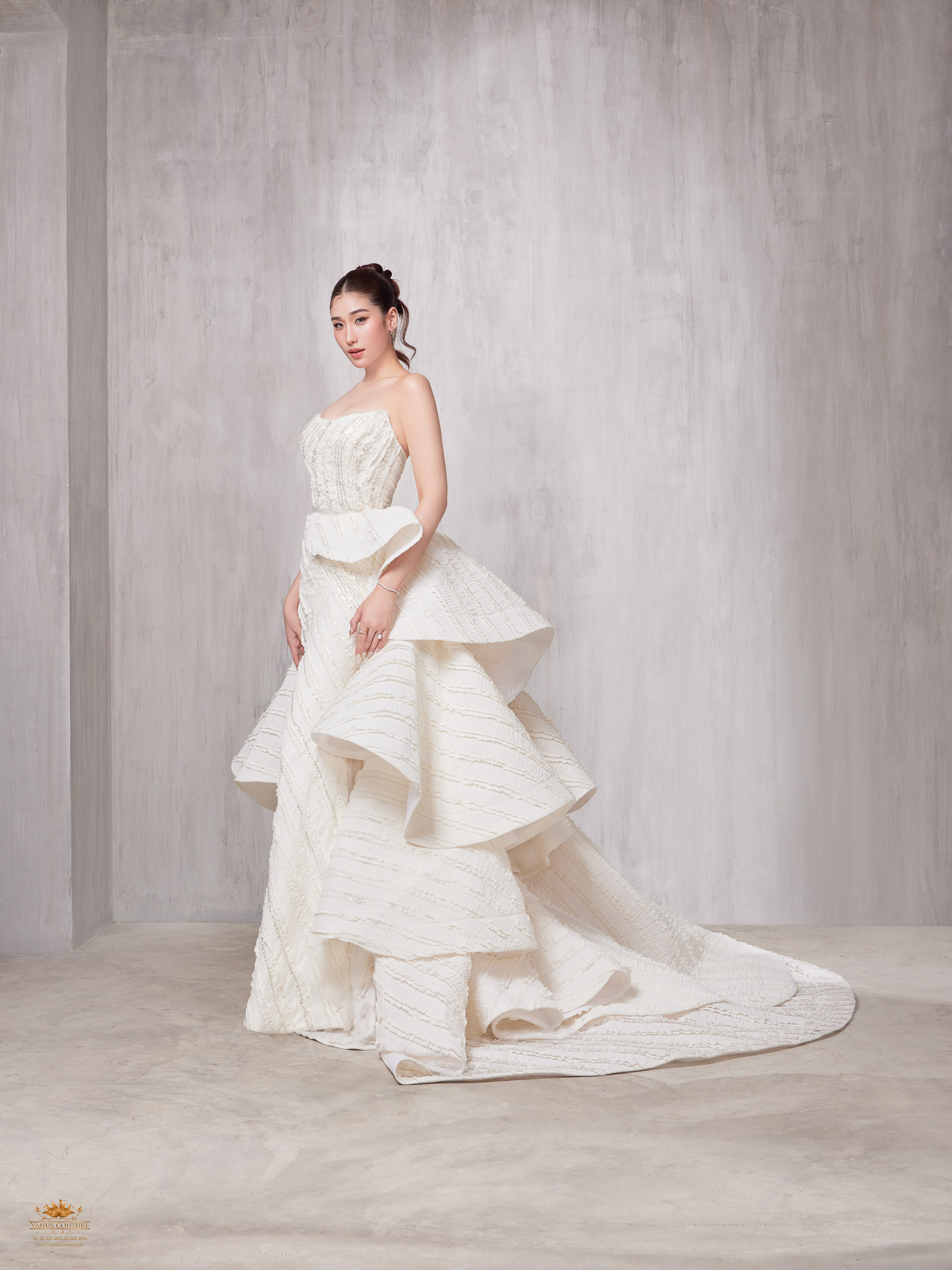 ชุดที่ 3 ชุดเกาะอกรูปตัวยูสุดคลาสสิก ที่โดดเด่นด้วยดีไซน์ทรัมเป็ตพิเศษ ตัดเย็บจากผ้าทอเท็กซ์เจอร์หรูคุมด้วยเคปเครปทรงเอไลน์ที่ถูกดีไซน์ให้ไล่ระดับระบายอย่างมีมิติ ราวกับคลื่นพริ้วเบาในสายลม ความงามของชุดนี้อยู่ที่โครงสร้างและชั้นเชิงการตัดเย็บแต่ละเลเยอร์ของผ้าแทรกด้วยลายเส้นนูนละเอียด พร้อมการปักตกแต่งด้วยลูกปัดเลื่อมเงาวาว ที่ช่วยสะท้อนแสงระยิบระยับแบบไม่ต้องง้อแสงไฟ เมื่อเจ้าสาวสวมใส่ จะรู้สึกถึงความมั่นใจแต่แฝงไว้ด้วยความนุ่มนวลแบบผู้หญิงยุคใหม่ ชุดนี้เหมาะสำหรับเจ้าสาวที่ชอบความโฉบเฉี่ยวทันสมัยแต่ไม่ทิ้งกลิ่นอายความฟุ้งฝัน เป็นลุคที่สวยเฉียบ ไม่จำเจ และถ่ายรูปมุมไหนก็เป๊ะปังทุกซีน