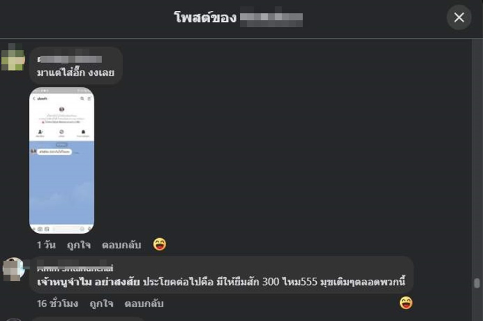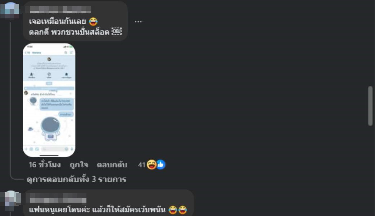 หลังจากโพสต์ดังกล่าวเผยแพร่ออกไป ชาวเน็ต มาคอมเมนต์กันสนั่นว่าเจอแบบนี้เหมือนกัน อาทิ เจอเหมือนกันเลย ตลกดี พวกชวนปั่นสล็อต, แฟนหนูเคยโดนค่ะ แล้วก็ให้สมัครเว้บพนัน, เจอบ่อยมากกก, มุขเดิมๆๆ, มาแต่ไส๋อี๊ก งงเลย, เจ้าหนูจำไม อย่าสงสัย ประโยคต่อไปคือ มีให้ยืมสัก 300 ไหม555 มุขเดิมๆตลอดพวกนี้ เป็นต้น