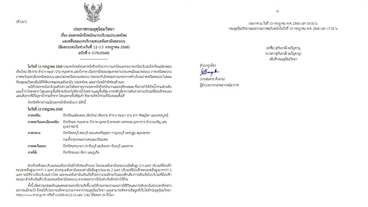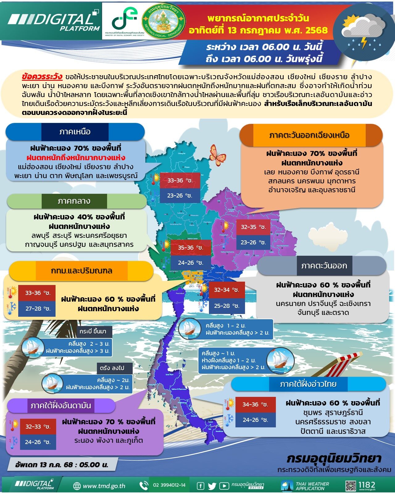 ขณะเดียวกัน กรมอุตุนิยมวิทยา ประกาศกรมอุตุนิยมวิทยา เรื่อง ฝนตกหนักถึงหนักมากบริเวณประเทศไทย และคลื่นลมแรงบริเวณทะเลอันดามันตอนบน (มีผลกระทบในช่วงวันที่ 12-13 กรกฎาคม 2568) ฉบับที่ 6 (179/2568) ความว่า ในวันที่ 13 ก.ค.รกฎาคม 2568 ประเทศไทยมีฝนตกหนักถึงหนักมากบางแห่งโดยเฉพาะภาคเหนือบริเวณจังหวัดแม่ฮ่องสอน เชียงใหม่ เชียงราย ลำปาง พะเยา น่าน หนองคาย และบึงกาฬ
