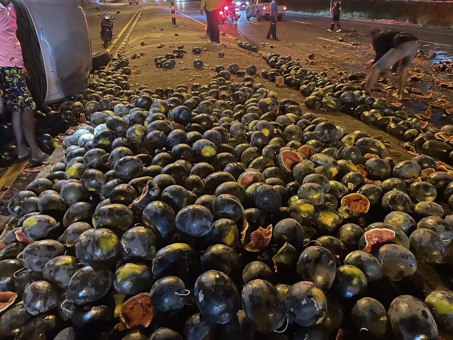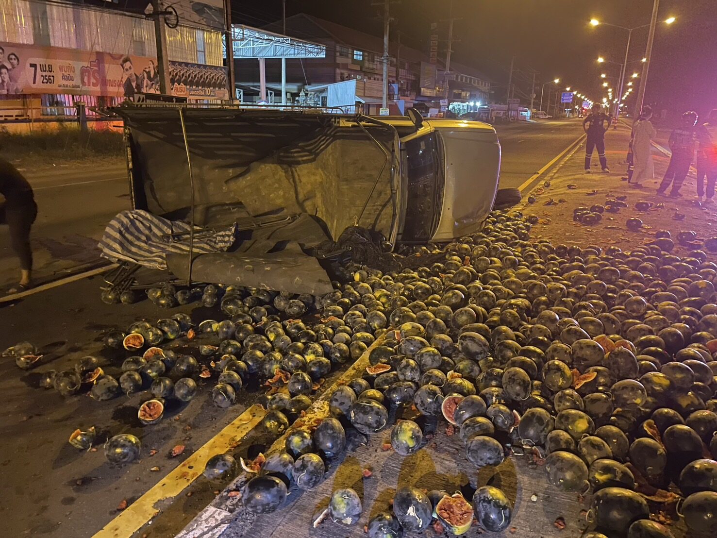 รถแตงโมคว่ำ พ่อค้าลงทุน 1.5 หมื่น จะเอาไปขาย ขับมาดีๆเทกระจาด