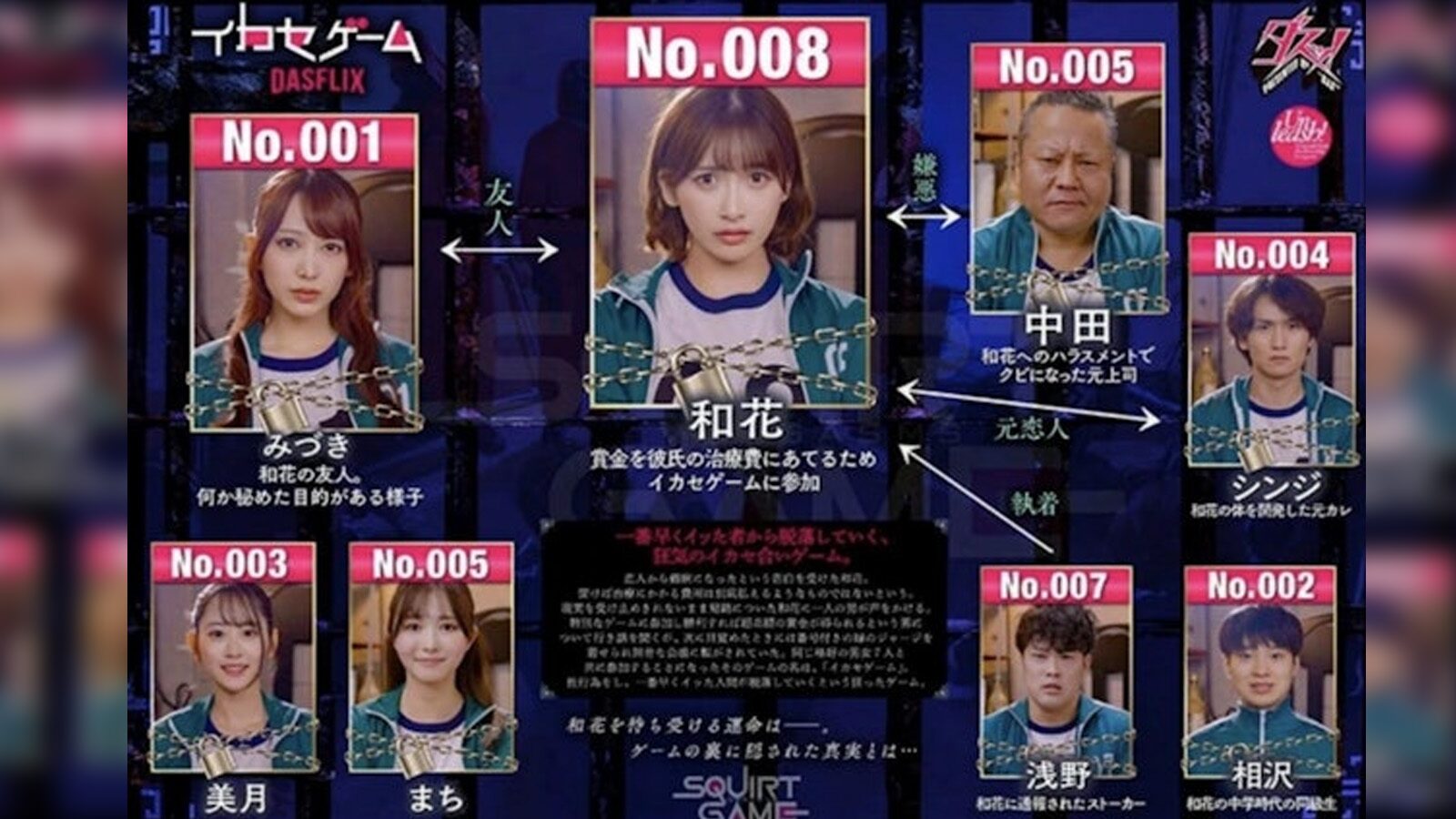 แต่ดูเหมือนว่าเวอร์ชันของ FANZA จะถูกพูดถึงมากที่สุด นำแสดงโดย มิโซโนะ วากะ, ยาโยอิ มิซึกิ ซึ่งมีการผลิตที่จริงจังมาก แม้แต่ปกก็ยังเลียนแบบ Netflix อีกทั้งยังมีการทำแผนผังความสัมพันธ์ของตัวละครด้วย