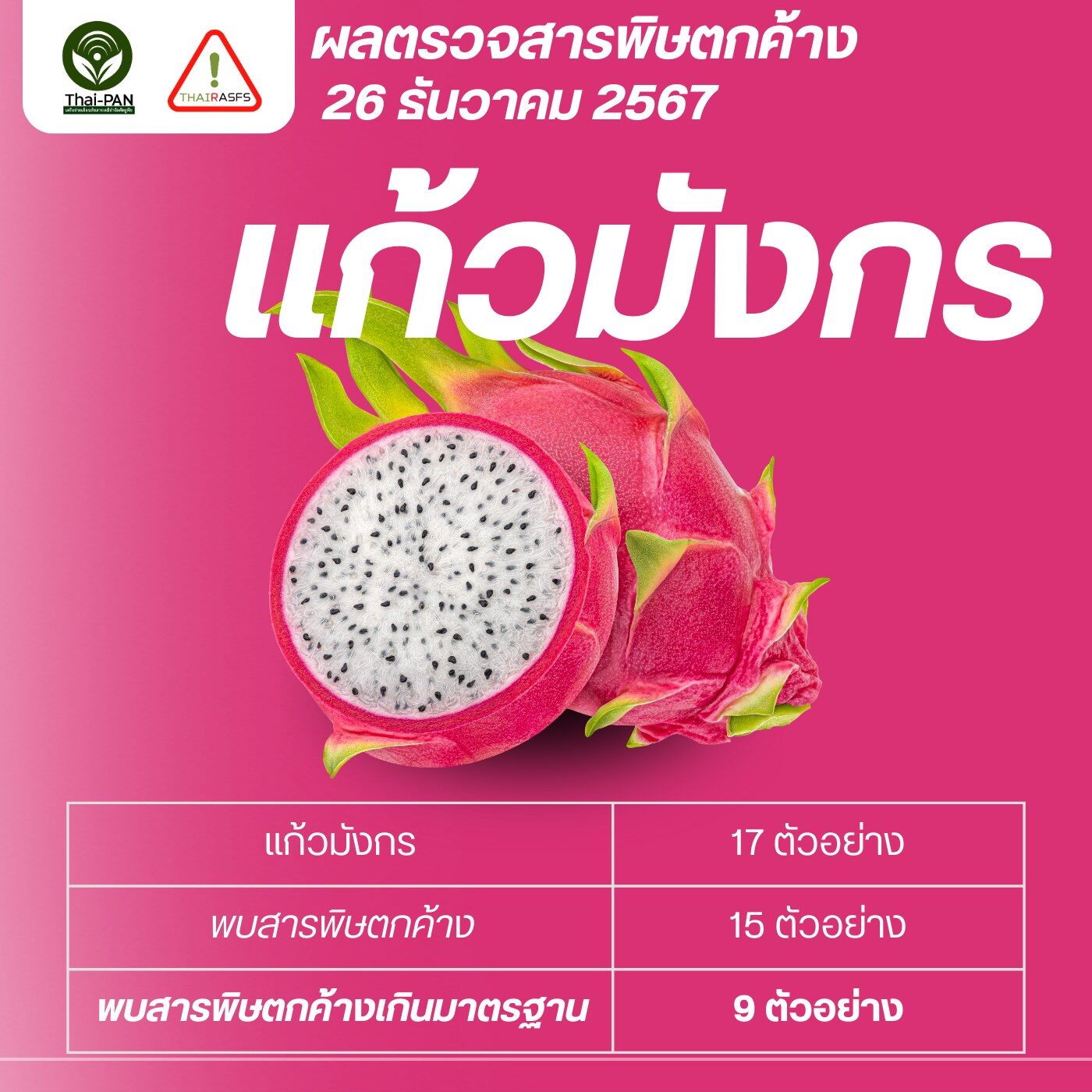 แก้วมังกร พบสารพิษตกค้างเกินมาตรฐาน 9 ตัวอย่าง จาก 17 ตัวอย่าง = 53%