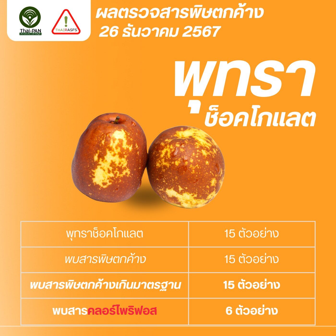 พุทราช็อกโกแลต พบสารพิษตกค้างเกินมาตรฐาน 15 ตัวอย่าง จาก 15 ตัวอย่าง = 100%