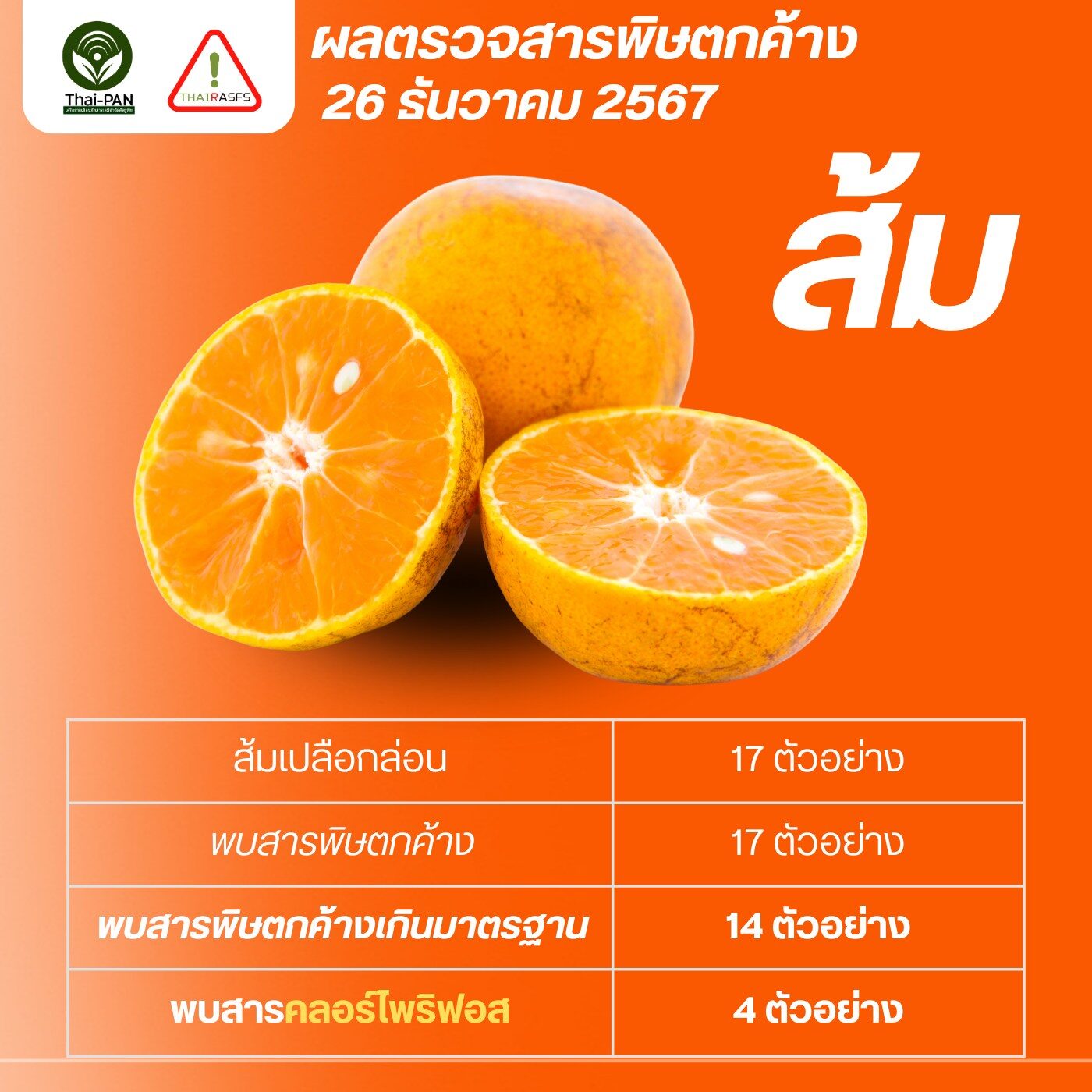 ส้ม พบสารพิษตกค้างเกินมาตรฐาน 14 ตัวอย่าง จาก 17 ตัวอย่าง = 82%