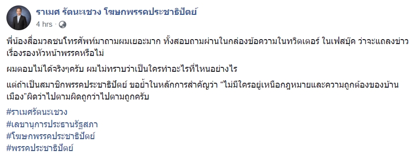 ล่าสุดวันนี้ (14 เม.ย.2565) นายราเมศ รัตนะเชวง โฆษกพรรคประชาธิปัตย์ โพสต์เฟซบุ๊ก ระบุว่า “พี่น้องสื่อมวลชนโทรศัพท์มาถามผมเยอะมาก ทั้งสอบถามผ่านในกล่องข้อความในทวิตเตอร์ ในเฟสบุ๊ค ว่าจะแถลงข่าวเรื่องรองหัวหน้าพรรคหรือไม่ ผมตอบไม่ได้จริงๆ ครับ ผมไม่ทราบว่าเป็นใครทำอะไรที่ไหนอย่างไร แต่ถ้าเป็นสมาชิกพรรคประชาธิปัตย์ ขอย้ำในหลักการสำคัญว่า “ไม่มีใครอยู่เหนือกฎหมายและความถูกต้องของบ้านเมือง” ผิดว่าไปตามผิดถูกว่าไปตามถูกครับ”
