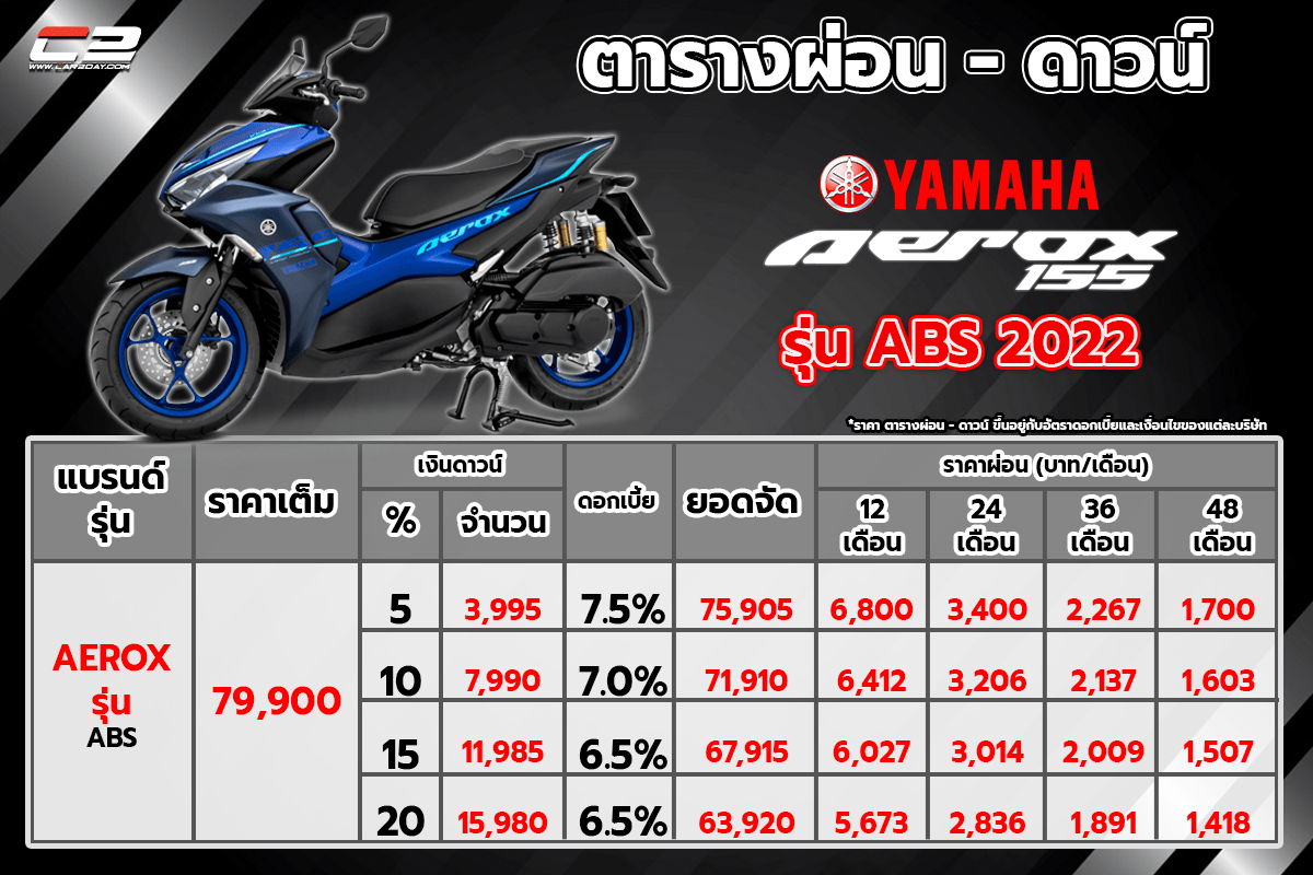ตารางผ่อน - ดาวน์ 2022 Yamaha AEROX รุ่น Standard