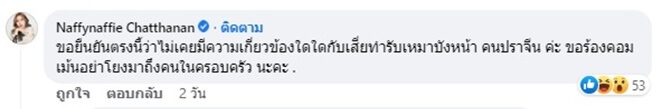 ไม่ต้องให้เดานาน เพราะนาฟ ฉัฐนันท์ ได้ใช้เฟซบุ๊ก Naffynaffie Chatthanan เข้ามาแสดงความคิดเห็นในโพสต์ของเฟซบุ๊ก หน่วยป้องกันและปราบปรามการกระทำความผิดเกี่ยวกับคอมพิวเตอร์ เพื่อยืนยันความบริสุทธิ์ของตัวเอง โดยเข้ามาชี้แจงชัดๆด้วยว่า "ขอยืนยันตรงนี้ว่าไม่เคยมีความเกี่ยวข้องใด ๆ กับเสี่ยทำรับเหมาบังหน้า คนปราจีน ค่ะ ขอร้องคอมเมนต์อย่าโยงมาถึงคนในครอบครัว นะคะ"