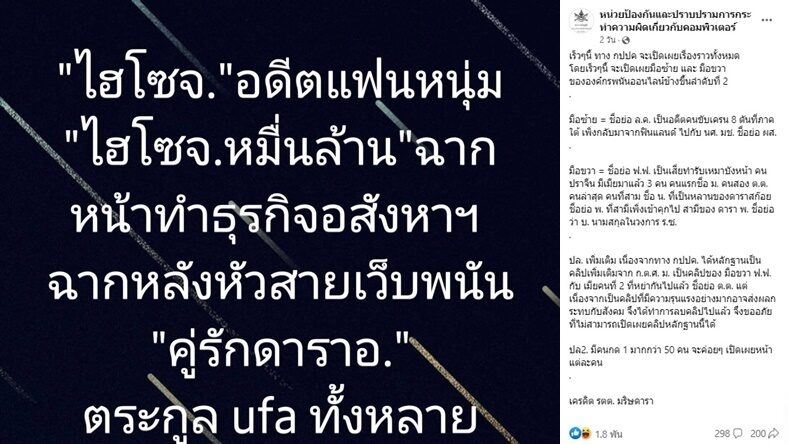 จากกรณี เพจหน่วยป้องกันและปราบปรามการกระทำความผิดเกี่ยวกับคอมพิวเตอร์ ออกมาโพสต์ถึง ไฮโซ จ. หมื่นล้าน คู่รักของดารา อ. มีฉากหน้าทำธุรกิจอสังหาริมทรัพย์ แต่ฉากหลังเป็นหัวสายเว็บพนัน Ufa