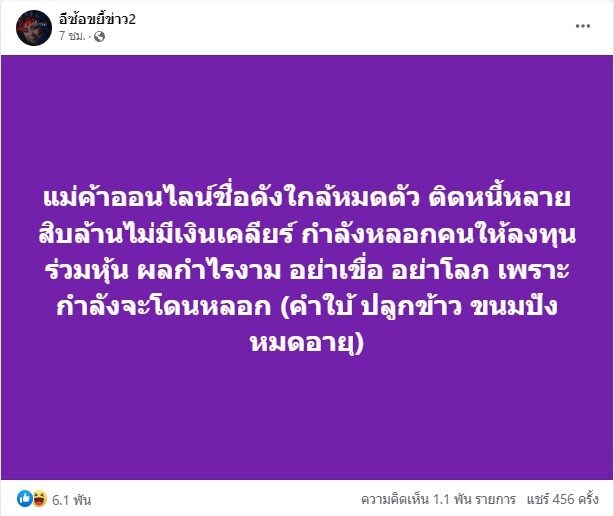 เพจ อีซ้อขยี้ข่าว2 ออกมาแฉประเด็นร้อนแรงโซเชียลอีกแล้ว พร้อมเตือนคนที่กำลังจะโดนหลอก อย่าไปหลงเชื่อร่วมลงทุนว่า แม่ค้าออนไลน์ชื่อดังใกล้หมดตัว ติดหนี้หลายสิบล้านไม่มีเงินเคลียร์ กำลังหลอกคนให้ลงทุน ร่วมหุ้น ผลกำไรงาม อย่าเชื่อ อย่าโลภ เพราะกำลังจะโดนหลอก (คำใบ้ ปลูกข้าว ขนมปัง หมดอายุ)