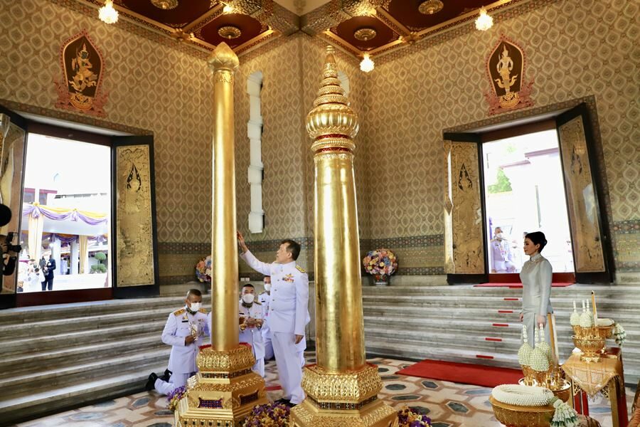 พระบาทสมเด็จพระเจ้าอยู่หัว และสมเด็จพระนางเจ้า ฯ พระบรมราชินี เสด็จเข้าศาลหลักเมือง พระบาทสมเด็จพระเจ้าอยู่หัว ทรงพระสุหร่าย ทรงเจิม ทรงปิดทอง และทรงผูกผ้าสีชมพูที่เสาพระหลักเมือง รัชกาลที่ 1 และทรงพระสุหร่าย ทรงเจิม ทรงปิดทอง และทรงผูกผ้าสีชมพูที่เสาพระหลักเมือง รัชกาลที่ 4 ทรงกราบ เสด็จพระราชดำเนินกลับ