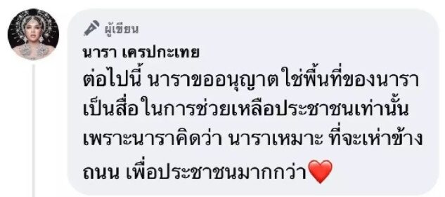 ขณะที่ นารา ก็ได้โพสต์เฟซบุ๊กหลังออกรายการด้วยว่า “ไม่ใช่ที่ของเรา ขอบคุณทุกคนมากนะคะ #เสียใจ ต่อไปนี้ นาราขออนุญาตใช้พื้นที่ของนาราเป็นสื่อในการช่วยเหลือประชาชนเท่านั้น เพราะนาราคิดว่า นาราเหมาะที่จะเห่าข้างถนน เพื่อประชาชนมากกว่า”