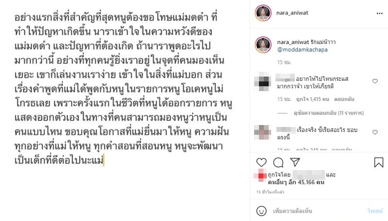 โดยได้แท็กไอจีถึงมดดำ คชาภา พร้อมแคปชั่นด้วยว่า รักแม่น๊าาา @moddamkachapa ขณะที่ยังดราม่าไม่จบชาวเน็ตยังเข้ามาวิพากษ์วิจารณ์ต่างๆ นานา อาทิ