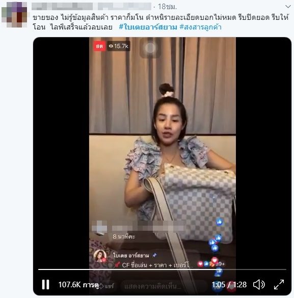 แห่ร้องเต็มโซเชียล แจ้งสคบ.แจ้งความ ชี้เป้าดาราอื่นน่าซื้อกว่ามาก จากกรณีดราม่าของนักร้องสาว ใบเตย สุธีวัน หรือใบเตย อาร์สยาม ผันตัวมาเป็นแม่ค้าออนไลน์ ขนแบรนด์เนมมาไลฟ์สดขายผ่านโซเชียล กลายเป็นดราม่า เมื่อลูกค้าหลายรายที่ซื้อสินค้าจากสาว ใบเตย ออกมาแฉว่าสินค้าที่ได้รับ ไม่ได้คุณภาพตามที่แจ้งไว้บ้าง สินค้าราคาแพงเวอร์ แพงกว่ามือหนึ่งตอนนี้อีก