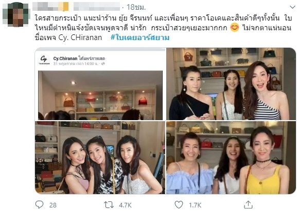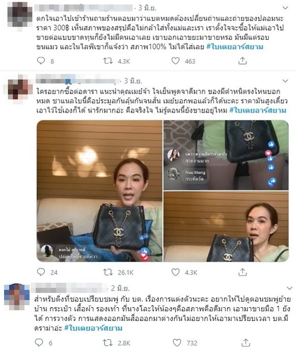 โดยชาวเน็ตยังมีการวิจารณ์เปรียบเทียบ แนะนำด้วยว่า “ใครอยากซื้อต่อดารา แนะนำคุณเมย์จ้า ใจเย็นพูดจาดีมาก ของมีตำหนิตรงใหนบอกหมด ชาแนลใบนี้คือประมูลกันลุ้นกันจนสั่น เมย์บอกพอแล้วก็ได้นะคะ ราคามันสูงเดี๋ยวเอาไว้ใช้เองก็ได้ น่ารักมากอ่ะ คือจริงใจ ไม่รู้ตอนนี้ยังขายอยู่ไหม #ใบเตยอาร์สยาม”