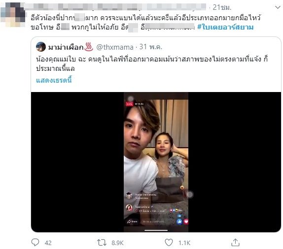 ทั้งนี้มีคนโวยไปถึงน้องชาย ใบเตย ร่วมไลฟ์ขายของกับพี่สาวด้วย ขณะฉะคนในไลฟ์ที่วิพากษ์วิจารณ์สินค้าดุเดือดว่า “อีตัวน้องนี่ปาก….มาก ควรจะแบนได้แล้วนะคะแล้วอีประเภทออกมายกมือไหว้ขอโทษ อี…. พวก…ไม่ให้อภัย อี…. อี….. #ใบเตยอาร์สยาม”