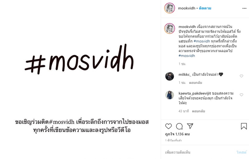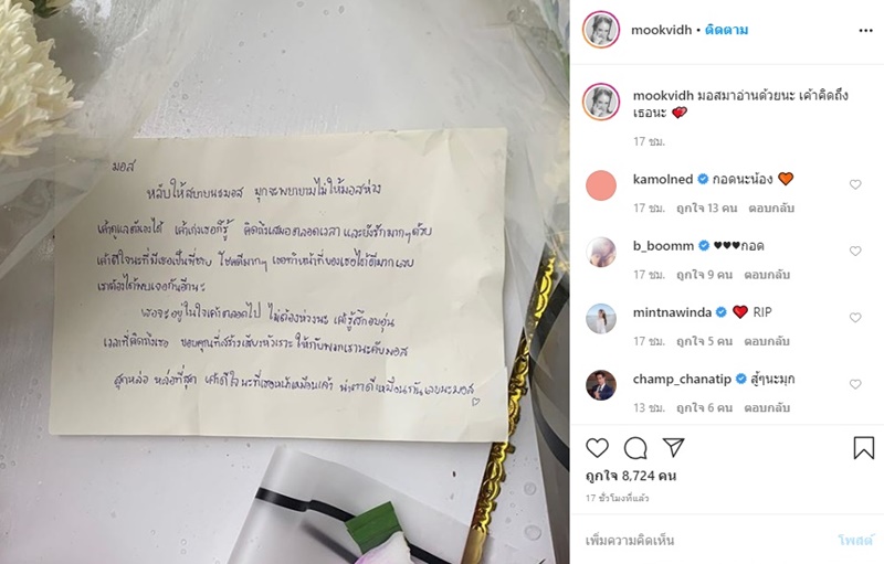 ทั้งยังเขียนข้อความสุดเศร้า อ่านแล้วน้ำตาไหลตามกับการสูญเสียครั้งใหญ่ของดาราสาว ที่ฝากถึงพี่ชาย ให้ มอส พี่ชาย อ่านด้วย