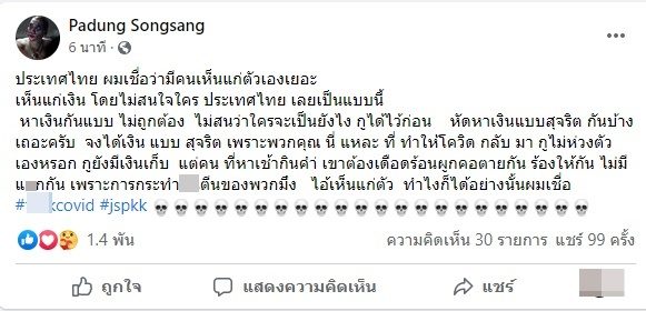 จงได้เงินแบบสุจริต เพราะพวกคุณนี่แหละที่ทำให้โควิดกลับมา กูไม่ห่วงตัวเองหรอก กูยังมีเงินเก็บ แต่คนที่หาเช้ากินค่ำเขาต้องเดือดร้อนผูกคอตายกัน ร้องให้กัน ไม่มีแ_กกัน เพราะการกระทำ…ตีนของพวกมึง ไอ้เห็นแก่ตัว ทำไงก็ได้อย่างนั้นผมเชื่อ