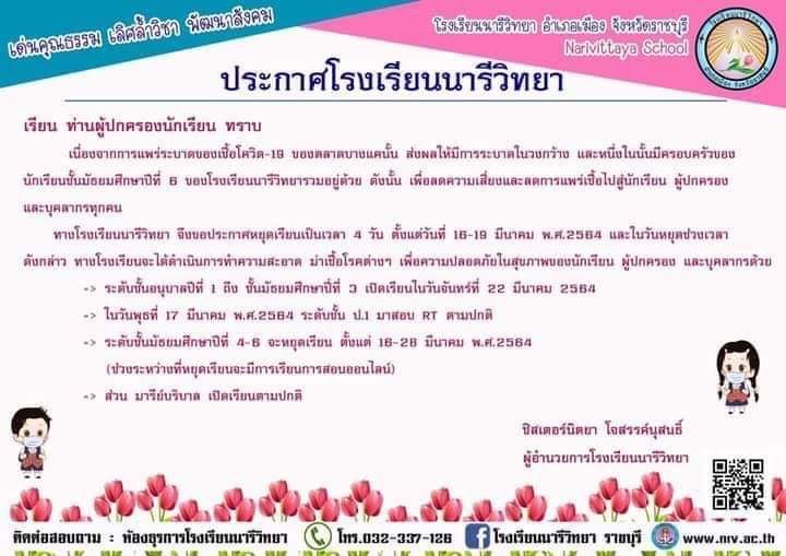 ดังนั้น เพื่อลดความเสี่ยงและลดการแพร่เชื้อไปสู่นักเรียน ผู้ปกครอง และบุคลากรทุกคน ทางโรงเรียนนารีวิทยา จึงขอประกาศหยุดเรียนเป็นเวลา 4 วัน ตั้งแต่วันที่ 16-19 มี.ค.64 และในวันหยุดช่วงเวลาดังกล่าว ทางโรงเรียนจะดำเนินการทำความสะอาด ฆ่าเชื้อโรคต่างๆ เพื่อความปลอดภัยในสุขภาพของนักเรียน ผู้ปกครอง และบุคลากรด้วย