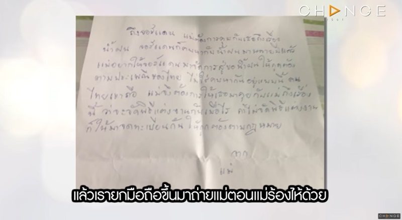 ตอนก่อนหน้านั้นที่ทะเลาะกับแม่ เราก็ใจร้ายบอกแม่ว่าอยากให้เราแต่งงานให้ไปบอกจอร์ดอนเอง เราก็รู้ว่าแม่พูดภาษาอังกฤษกับจอร์ดอนไม่ได้ เขาก็พูดภาษาไทยไม่ได้ แม่เลยเขียนจดหมายขึ้นมาให้คนแปลให้จอร์ดอน ยังส่งให้เพื่อนในกรุ๊ปดูว่าฉันบาปหรือเปล่า