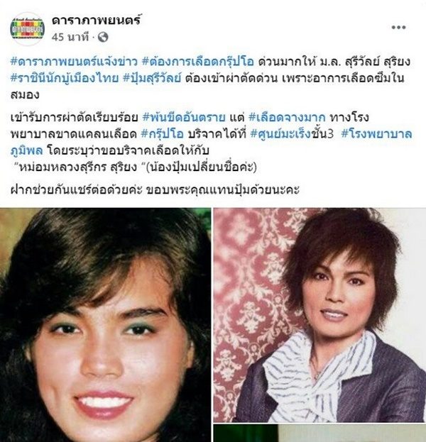 โดยเฟซบุ๊ก ดาราภาพยนตร์ ระบุว่า #ดาราภาพยนตร์แจ้งข่าว #ต้องการเลือดกรุ๊ปโอ ด่วนมากให้ ม.ล. สุรีวัลย์ สุริยง #ราชินีนักบู้เมืองไทย #ปุ้มสุรีวัลย์ ต้องเข้าผ่าตัดด่วน เพราะอาการเลือดซึมในสมอง เข้ารับการผ่าตัดเรียบร้อย #พ้นขีดอันตราย แต่ #เลือดจางมาก ทางโรงพยาบาลขาดแคลนเลือด #กรุ๊ปโอ บริจาคได้ที่ #ศูนย์มะเร็ง?ชั้น?3 #โรงพยาบาลภูมิพล โดยระบุว่าขอบริจาคเลือดให้กับ