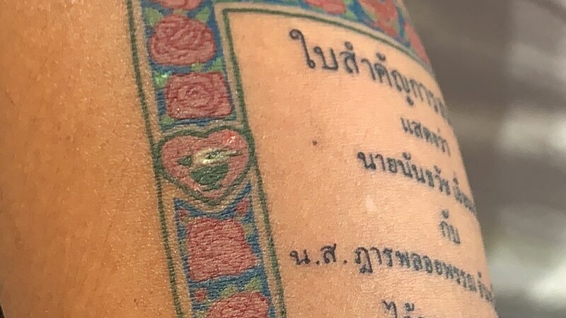 องค์ประกอบของใบทะเบียนสมรสสวยมาก ทั้งลวดลายและตัวหนังสือ ผมชอบมาก มองทุกวัน ทำให้นึกถึงว่า กว่าจะผ่านอะไรมาจนมีทุกวันนี้ได้ ตลอดหลายปีที่ผ่านมา ตนมีความสุขที่ได้มอง อยากขอบคุณช่างสักที่สักได้สวยมาก เกินกว่าที่คาดไว้