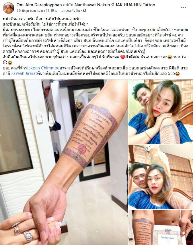 ตนเห็นว่าไม่ใช่เรื่องเสียหายอะไร จึงได้ติดต่อร้านสักที่รู้จักกัน พอสักออกมาแล้ว ขนาดตัวเองยังชอบเพราะรอยสักที่ได้สวยมาก ทั้งลายละเอียดเล็กๆน้อยๆหรือตัวหนังสือก็สวยเหมือนของจริงมาก เมื่อโพสต์ภาพไปมีแต่คนถามว่าไปบอกสามียังงัยถึงยอมสัก ไม่คิดว่าจะเหมือนจริงขนาดนี้