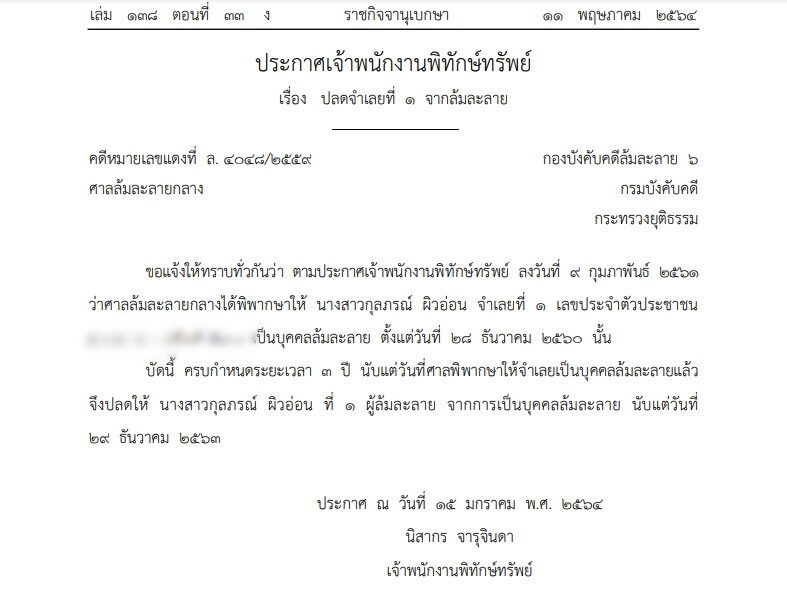 ราชกิจจาฯ ประกาศ ปลดบุคคลนามสกุลดัง ออกจากการล้มละลาย