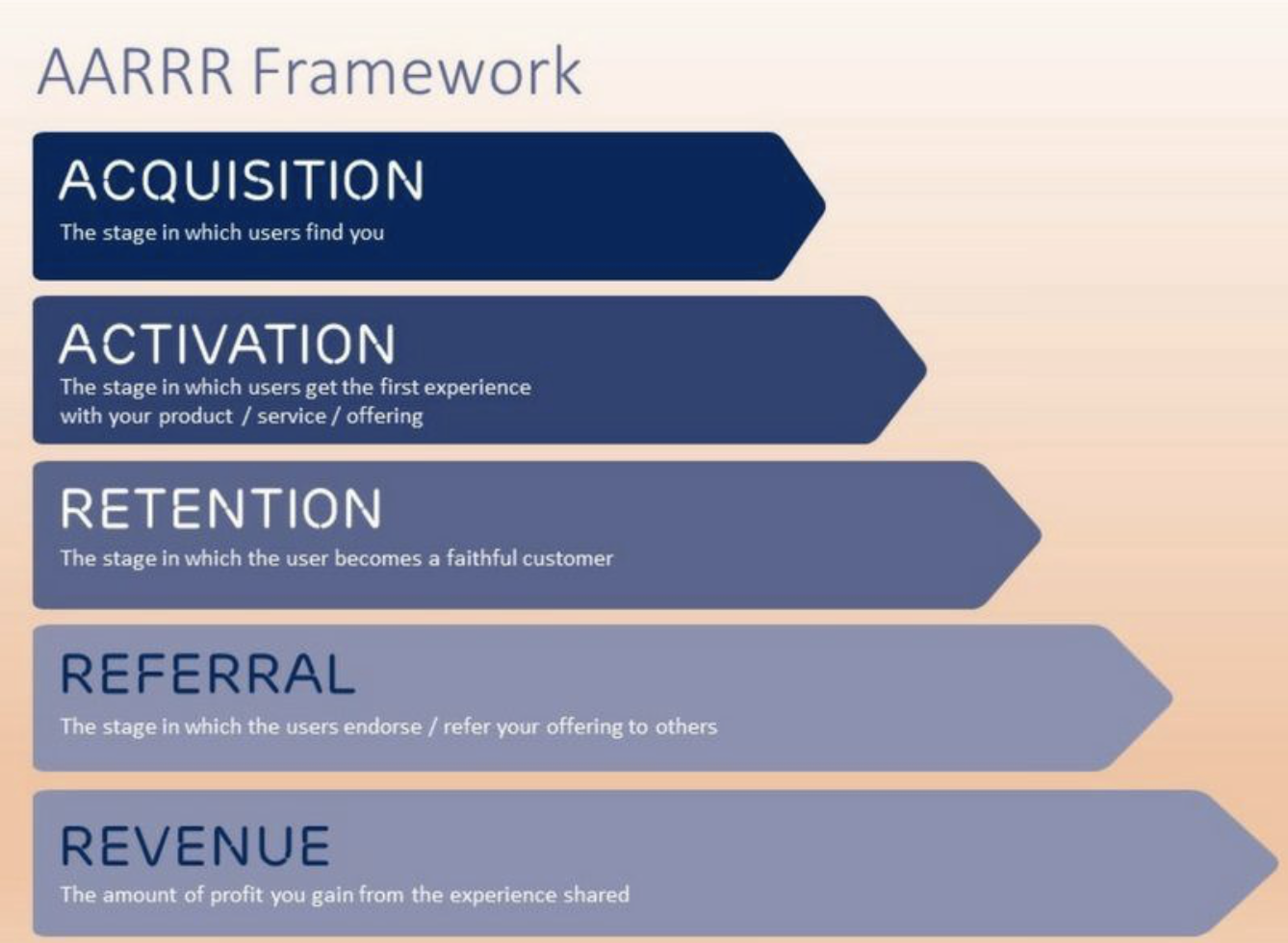 1. Awareness : ขั้นแรกคือการทำแบรนด์ตัวเองให้ปรากฏอยู่ในสายตาของกลุ่มเป้าหมายให้ได้ ทำให้กลุ่มเป้าหมายรู้จักคุณว่าคุณคือใคร และคุณมีกลยุทธ์อย่างไรที่จะสร้างให้คนนั้นรู้จักตัวองค์กรคุณได้ขึ้นมา ซึ่งด้วยกลยุทธ์นี้จะทำให้คุณนั้นมีจุดยืนที่แตกต่างจากคู่แข่ง ตัวอย่างเช่น Airbnb เคยใช้ Craglist ในการเข้าถึงกลุ่มเป้าหมายขึ้นมาแล้ว และทำให้คนมอง Airbnb เท่ากับบริษัทเทคโนโลยีด้านที่พัก