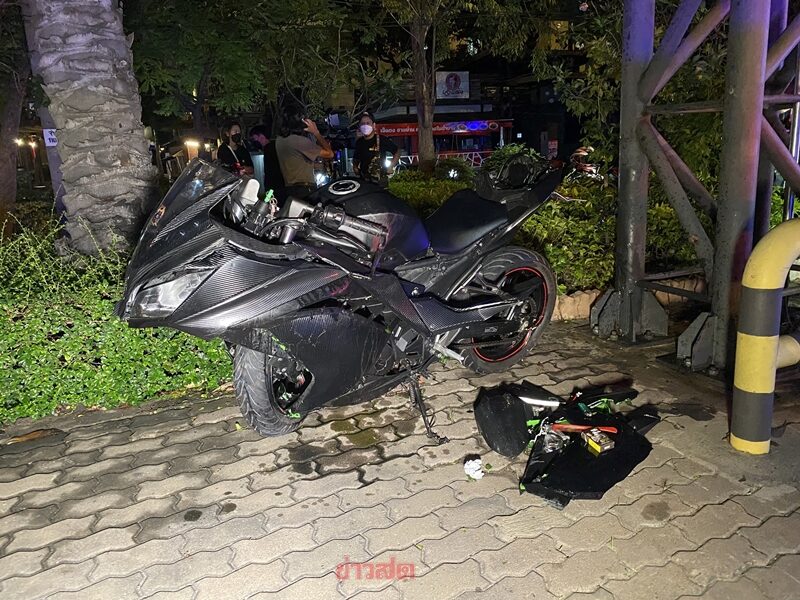 สภาพโช๊คคู่หน้าหัก แม็คและยางล้อหน้าแตก ซึ่งเป็นรถแต่งเต็มสูตร ลักษณะแหกโค้งพุ่งเสยฟุตบาทฟาดกับเสาป้ายทาง รถล้มคว่ำเข้าไปอยู่ในพุ่มต้นไม้ นอกจากนี้ ยังพบผู้บาดเจ็บชื่อ น.ส.ญัฐธิดา (ขอสงวนนามสกุล) อายุ 22 ปี ซึ่งเป็นผู้ซ้อนท้าย สภาพบาดเจ็บบริเวณสะโพก เจ้าหน้าที่เร่งช่วยส่งโรงพยาบาลสินแพทย์
