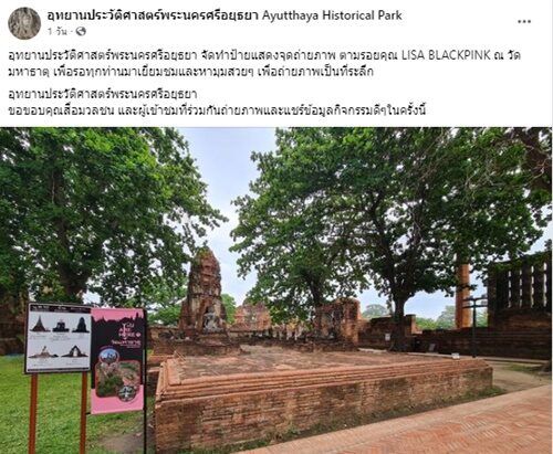 "อุทยานประวัติศาสตร์พระนครศรีอยุธยา จัดทำป้ายแสดงจุดถ่ายภาพ ตามรอยคุณ LISA BLACKPINK ณ วัดมหาธาตุ เพื่อรอทุกท่านมาเยี่ยมชมและหามุมสวยๆ เพื่อถ่ายภาพเป็นที่ระลึก